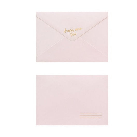 Weiße Karte mit dem Schriftzug ''Make a wish!'' und zwei Armbändern sowie einem rosafarbenen Umschlag mit goldenem Metallic-Aufdruck
