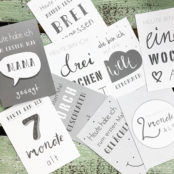Mit diesem Kartenset Meilensteinkarten Baby kannst du die Höhepunkte im ersten Lebensjahr ganz besonders festhalten und kreative Babybilder machen. Denn vor allem im ersten Jahr jagt ein Entwicklungsschritt den nächsten – Monat für Monat.