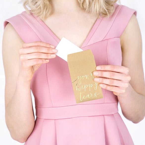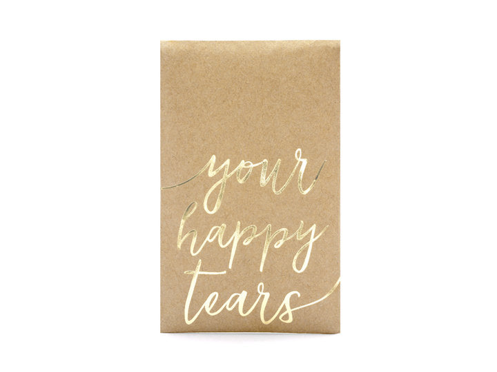 Taschentücher sind im Kraftpapier verpackt mit goldener Aufschrift "your happy tears".