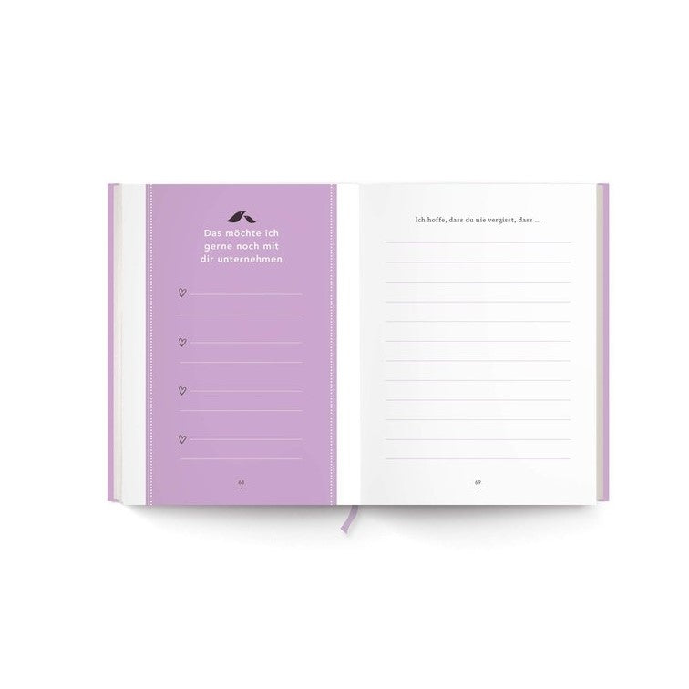 • Aufgeteilt in vier Themenblöcke: 1. Erinnerungen an früher, 2. Über die besondere Person, die du bist, 3. Warum du wichtig für mich bist, 4. Wünsche und Träume für uns beide