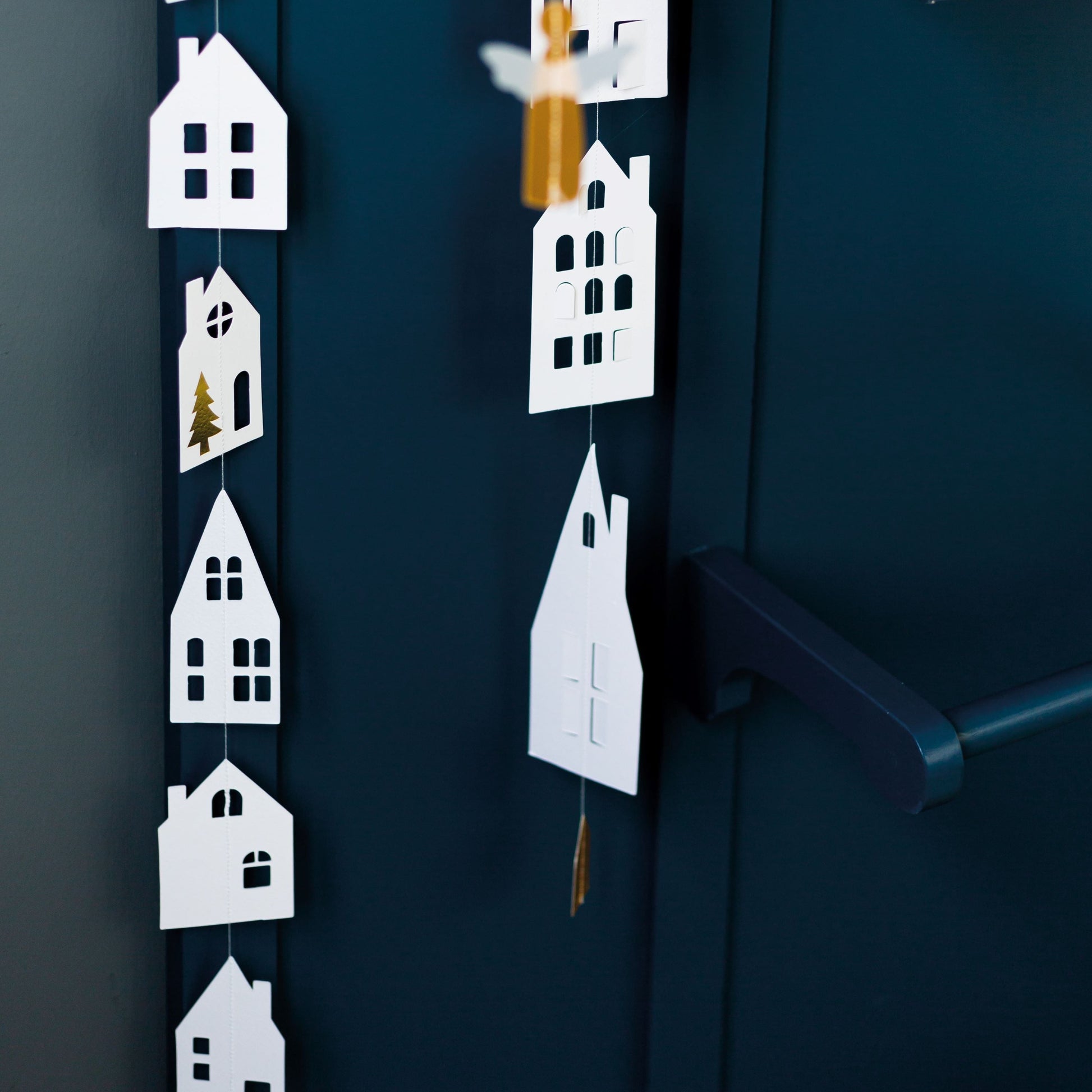 Material: Weißes Papier mit Heißsiegelung in gold, mit Fenstern und Türen zum Auffalten.