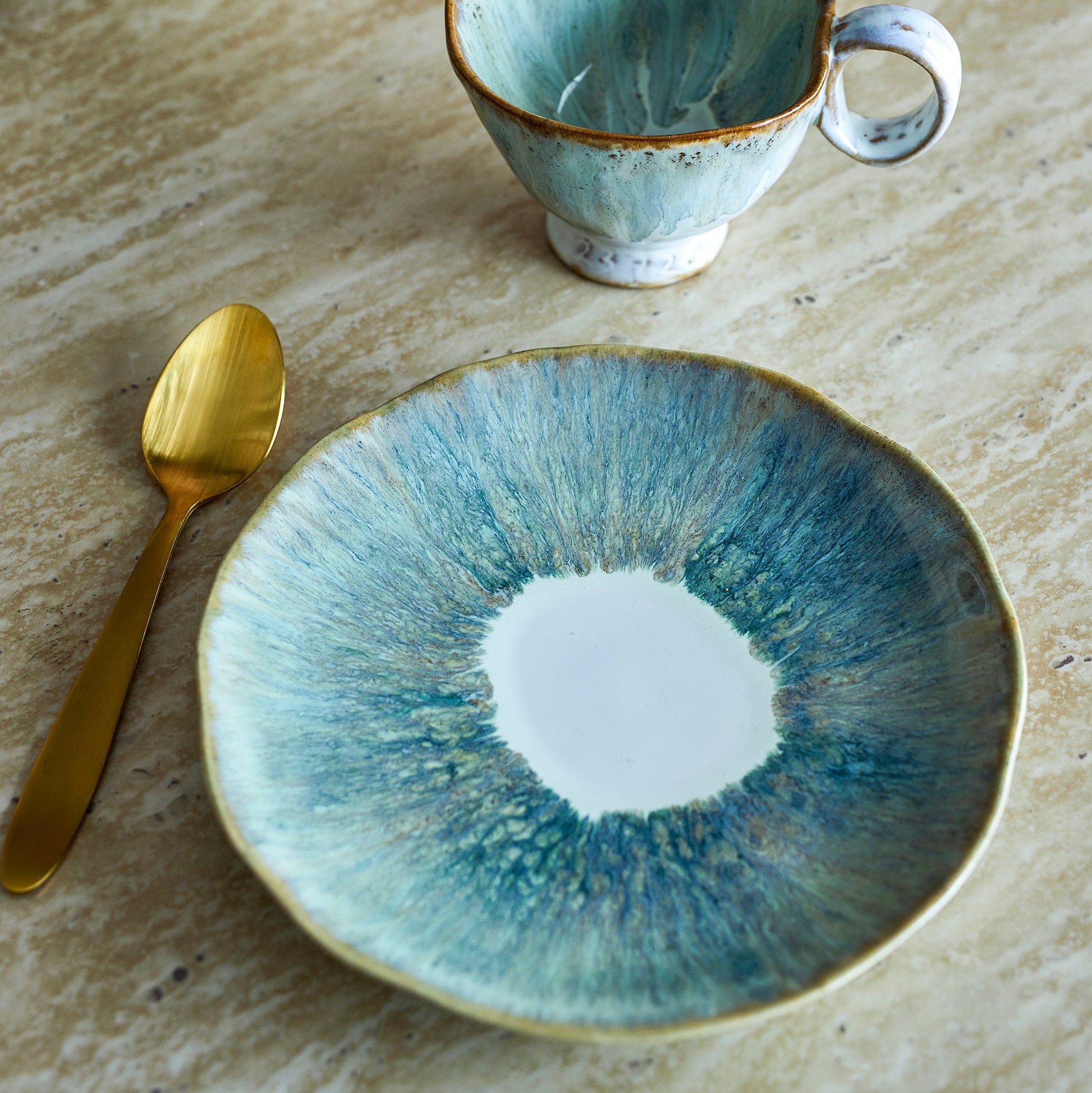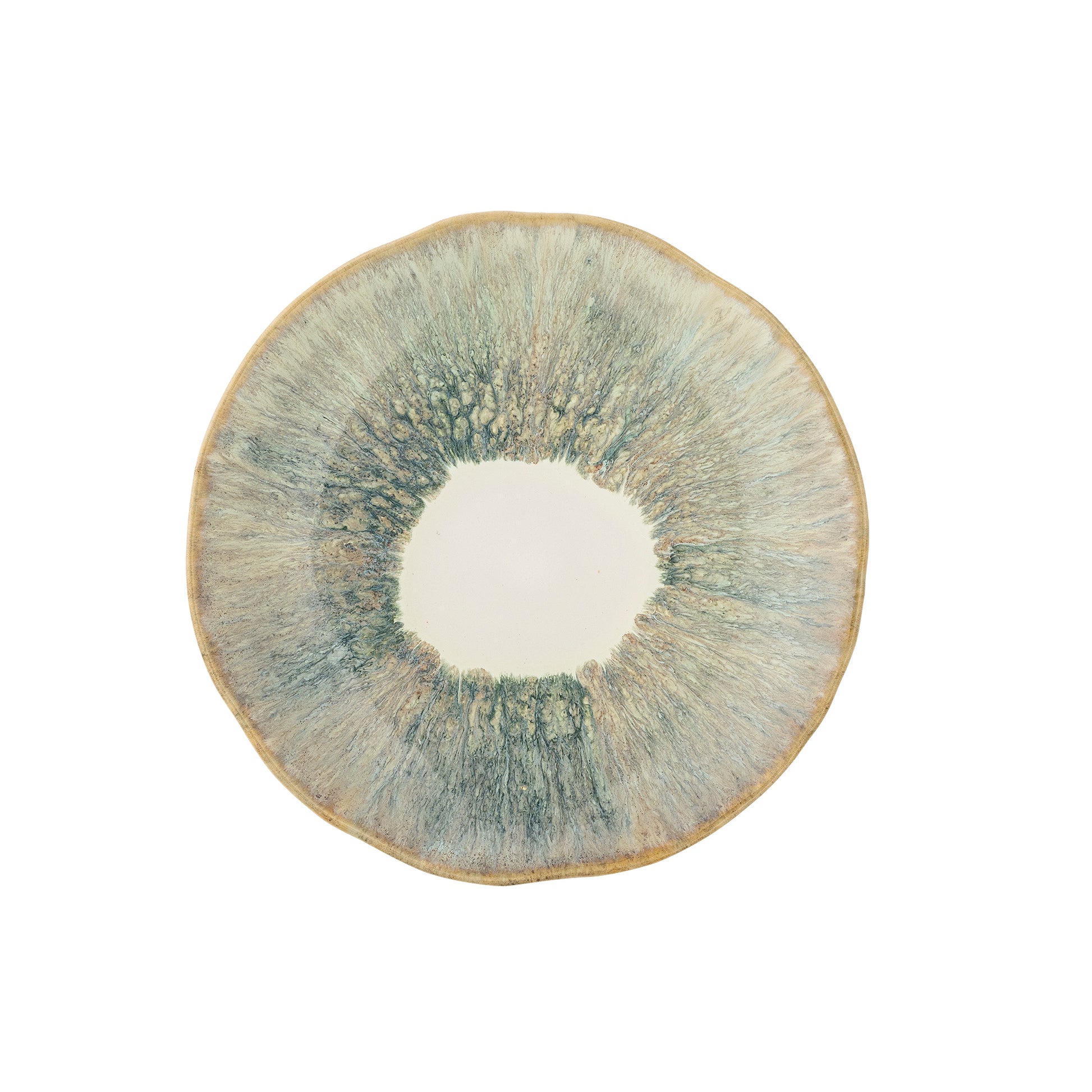 Der Imogen Teller von Bloomingville ist aus Steingut und mit einer reaktiven Glasur veredelt, die eine lebendige, strukturierte Oberfläche mit sanft geschwungenen, unregelmäßigen Kanten entstehen lässt. Ein weiches Beige im Zentrum wird von Grüntönen gerahmt, mit feinen Blau- und Braunakzenten. Leichte Abweichungen in Muster und Farbintensität sind möglich und machen jedes Stück zu einem Unikat.