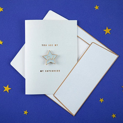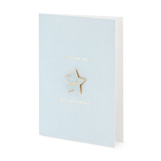 Blaue Karte mit metallisiertem Golddruck, sternförmiger Anstecknadel mit dem Wort Dad und blauem Umschlag mit metallisiertem Golddruck