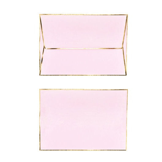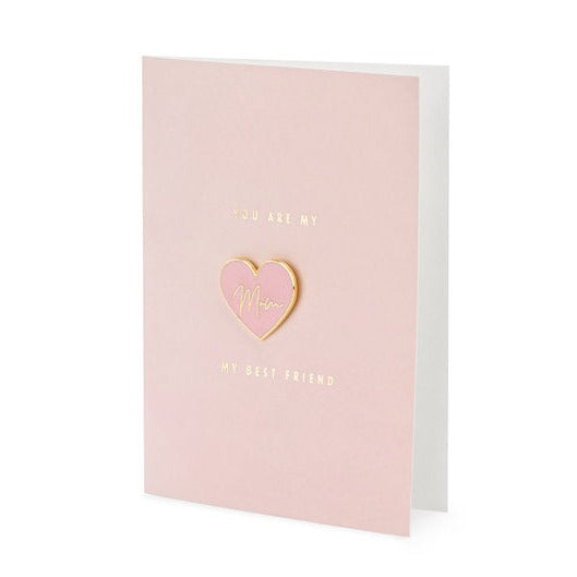 Rosafarbene Karte mit goldenem Metallic-Aufdruck, herzförmiger Anstecknadel mit dem Wort Mom und rosafarbenem Umschlag mit goldenem Metallic-Aufdruck