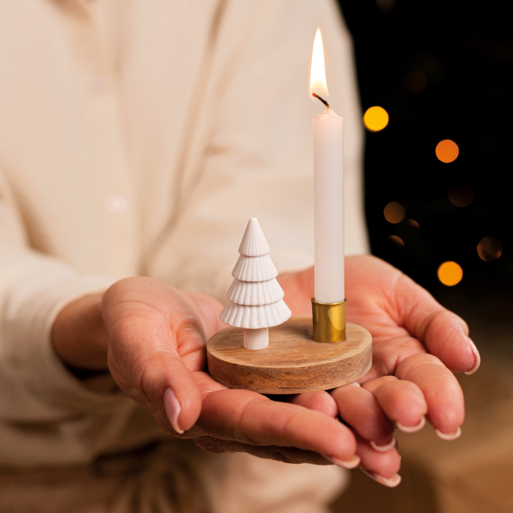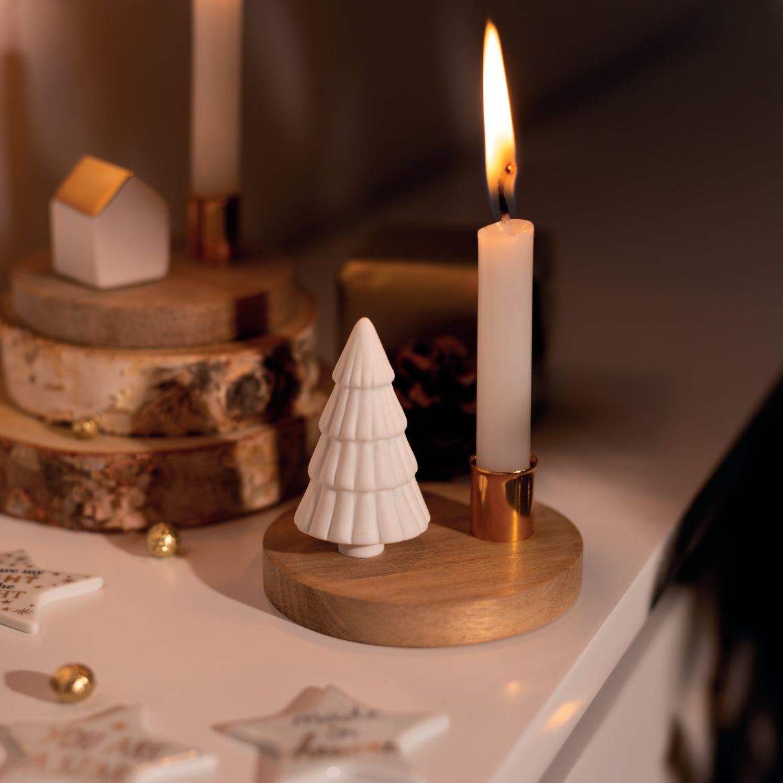 Material: Porzellan, teilweise mit Glasur. Holz, goldfarbene Metallhalterung für Baumkerzen.