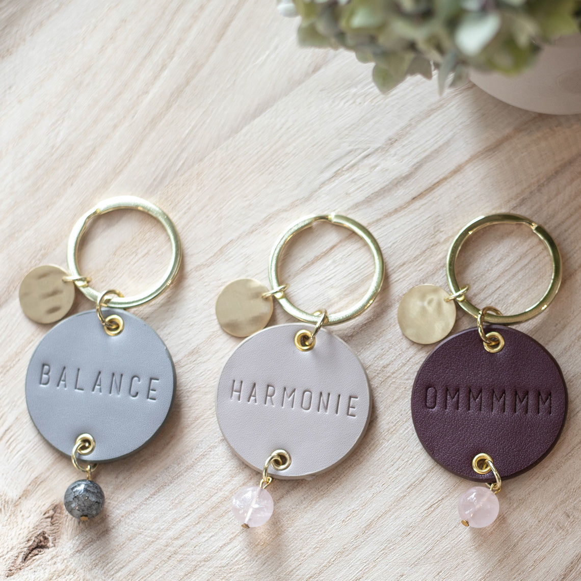 Material: Schlüsselanhänger aus geprägtem Leder mit Metallmünze und einer farbigen Steinkugel