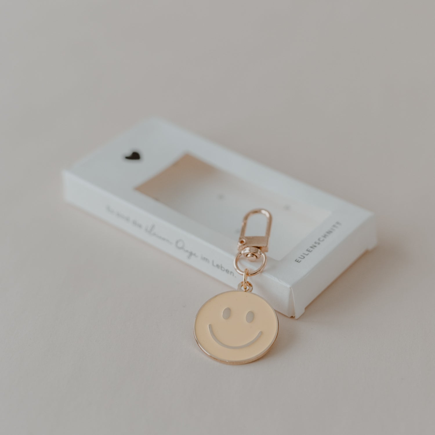 Zaubert Dir jeden Tag ein Lächeln ins Gesicht, wenn du deine Tür aufschließt, den Briefkasten öffnest oder dein Fahrrad abstellst. Unser Smiley Schlüsselanhänger ist in goldenem Design mit einem warmen Gelbton designt. Auf der Rückseite befindet sich unser Eulenschnitt Logo. Unsere Schlüsselanhänger sind super leicht und handlich.