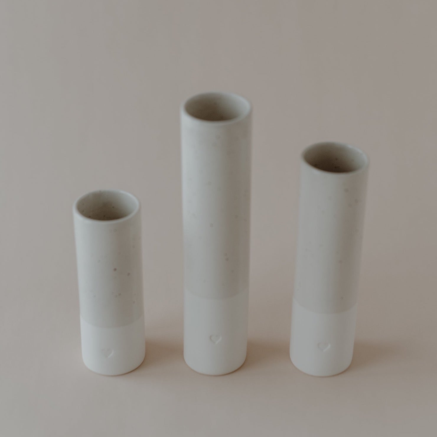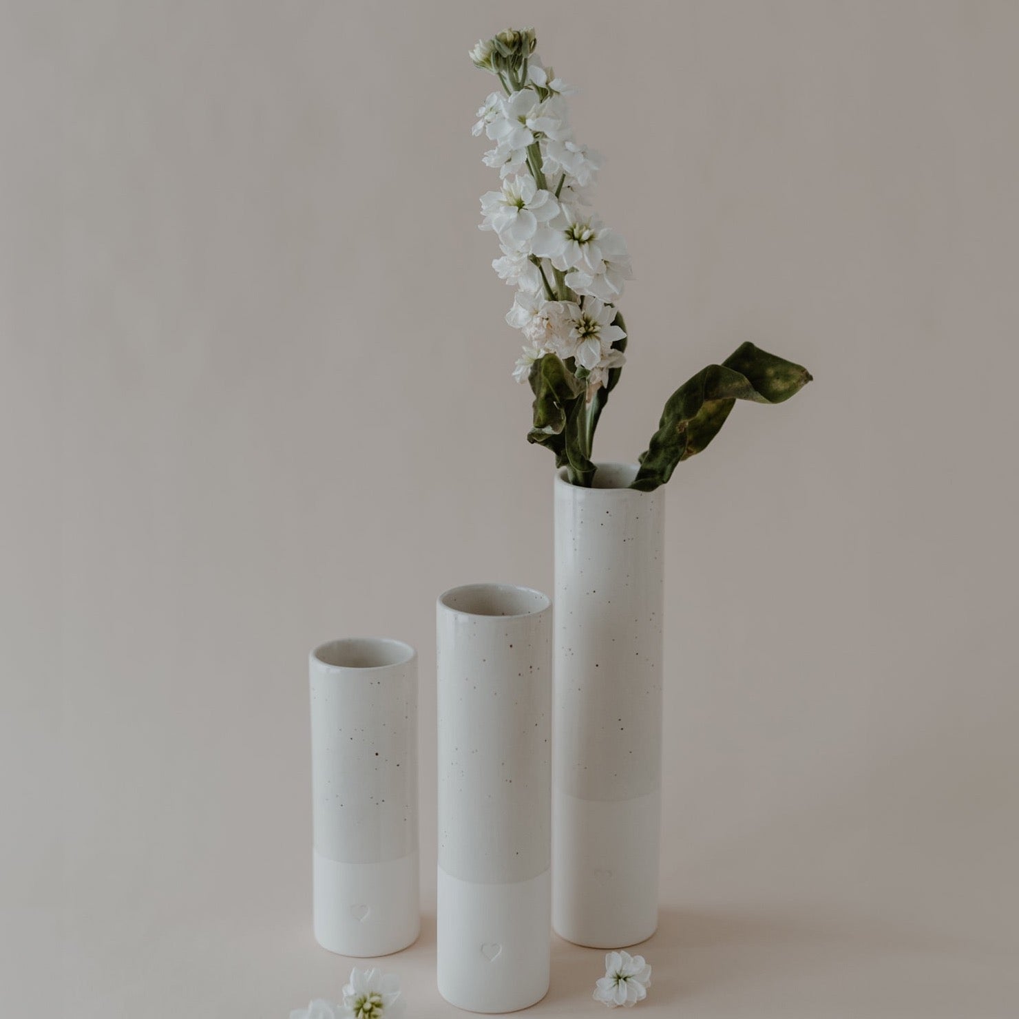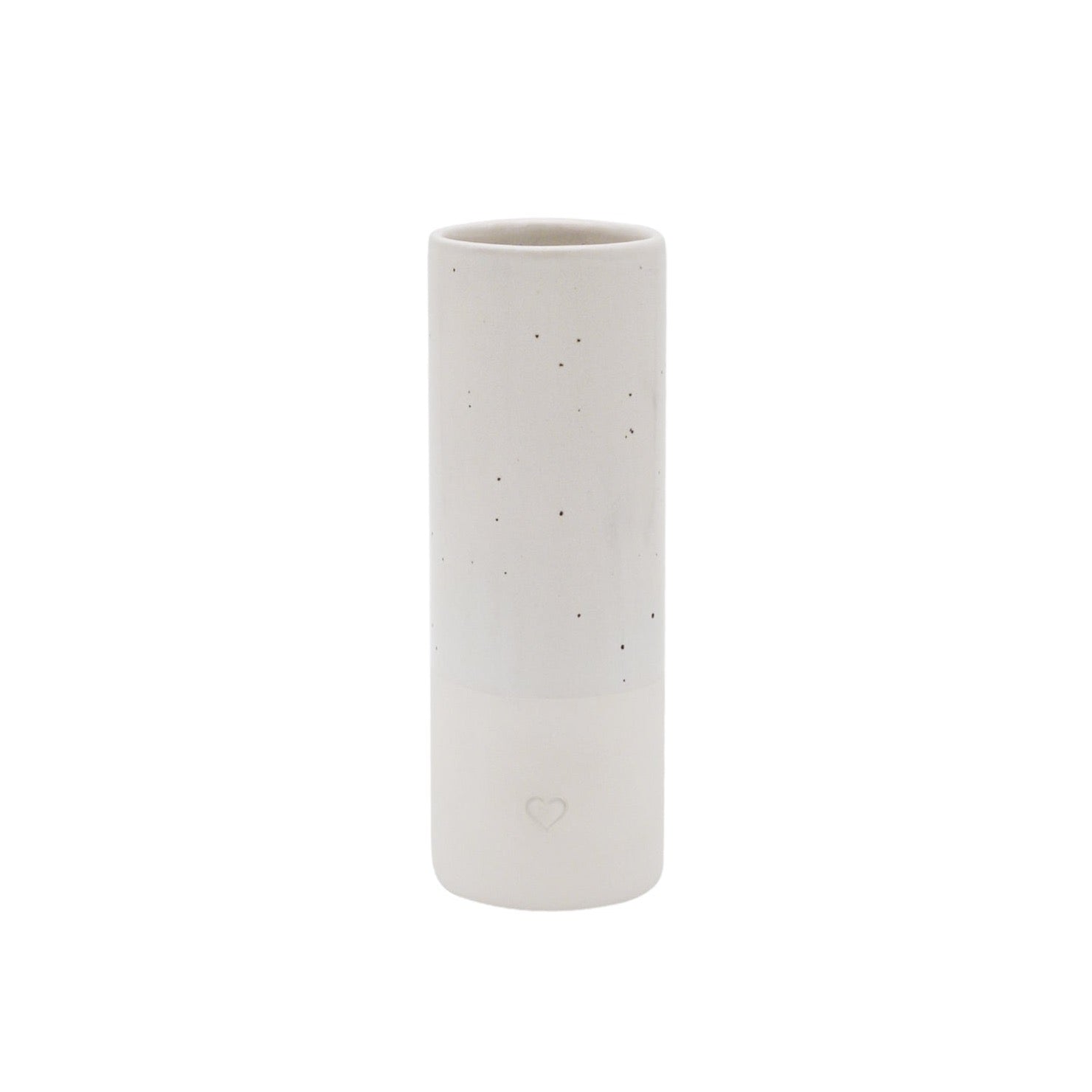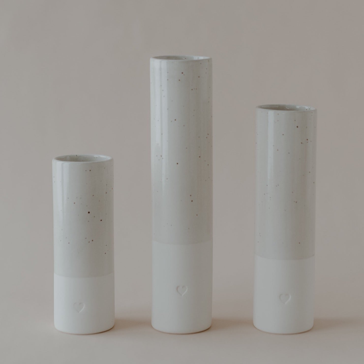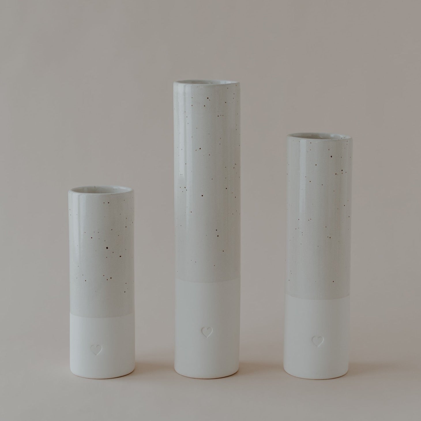 Der Steingutton besticht durch ein wundervolles natürliches Weiß und wird durch unsere spezielle Glasur mit kleinen braunen Tupfern vollendet. Das ganz besondere Etwas bekommt die zylindrische und schlichte Vase durch die wundervolle Blindprägung "Love".