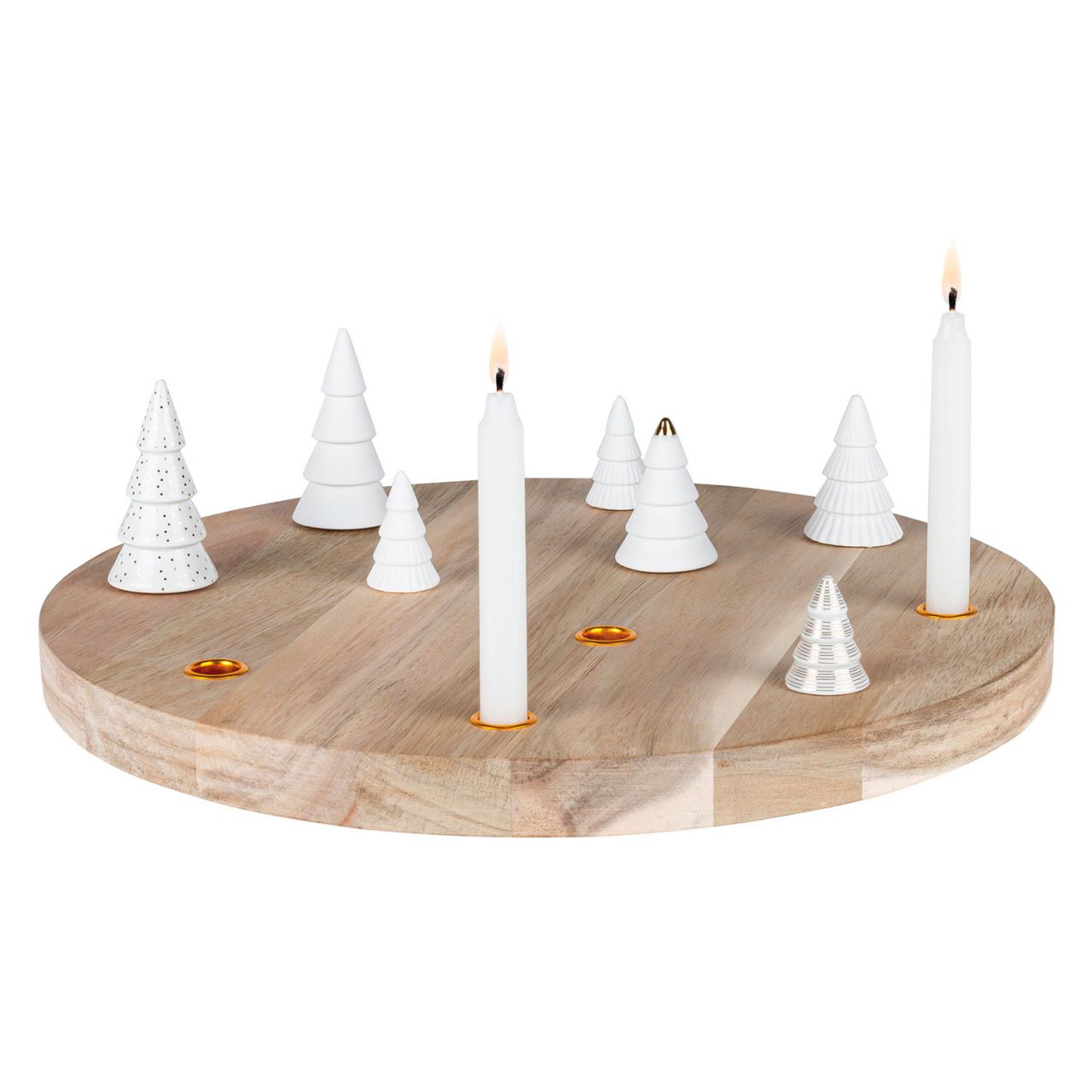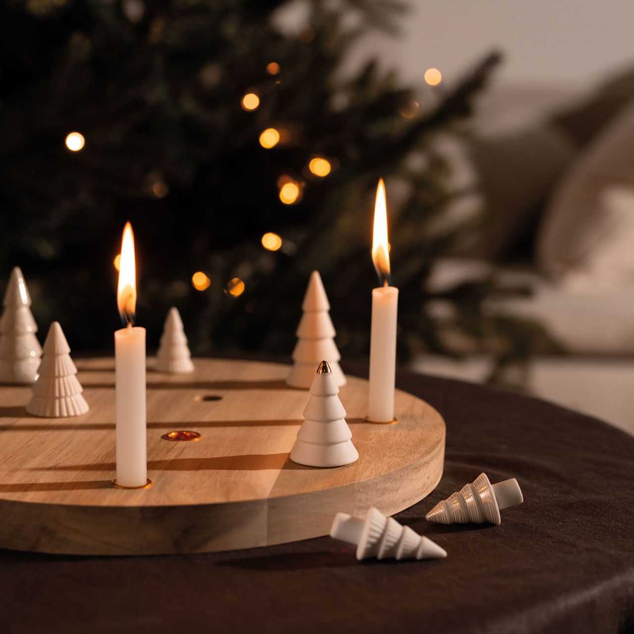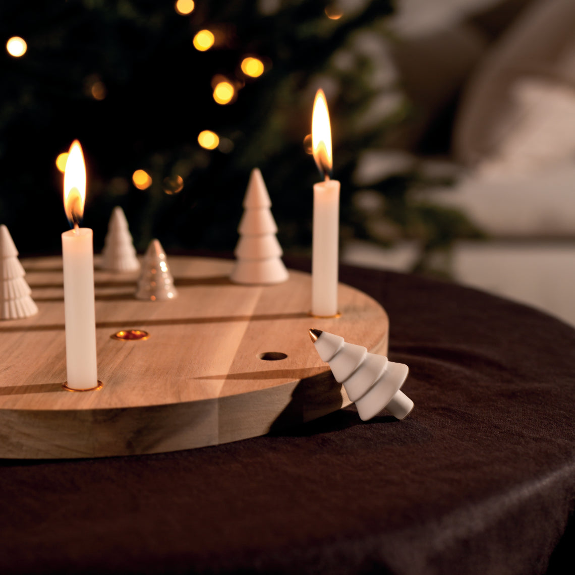 Material: Platte aus Akazienholz mit vorgebohrten Löchern, 3-D Tannen und Baumkerzenhülsen aus Aluminium, die individuell angeordnet werden können.