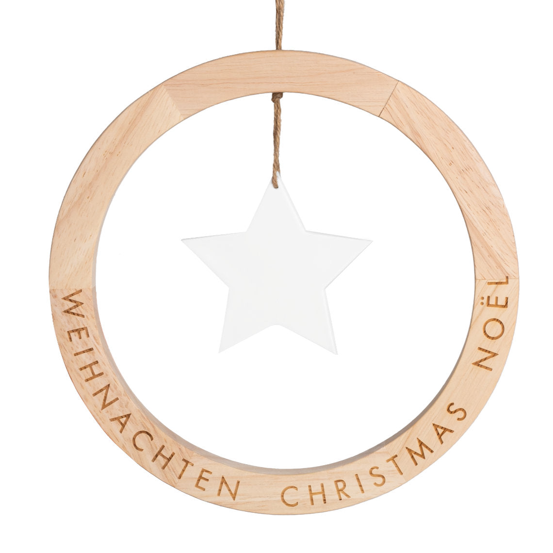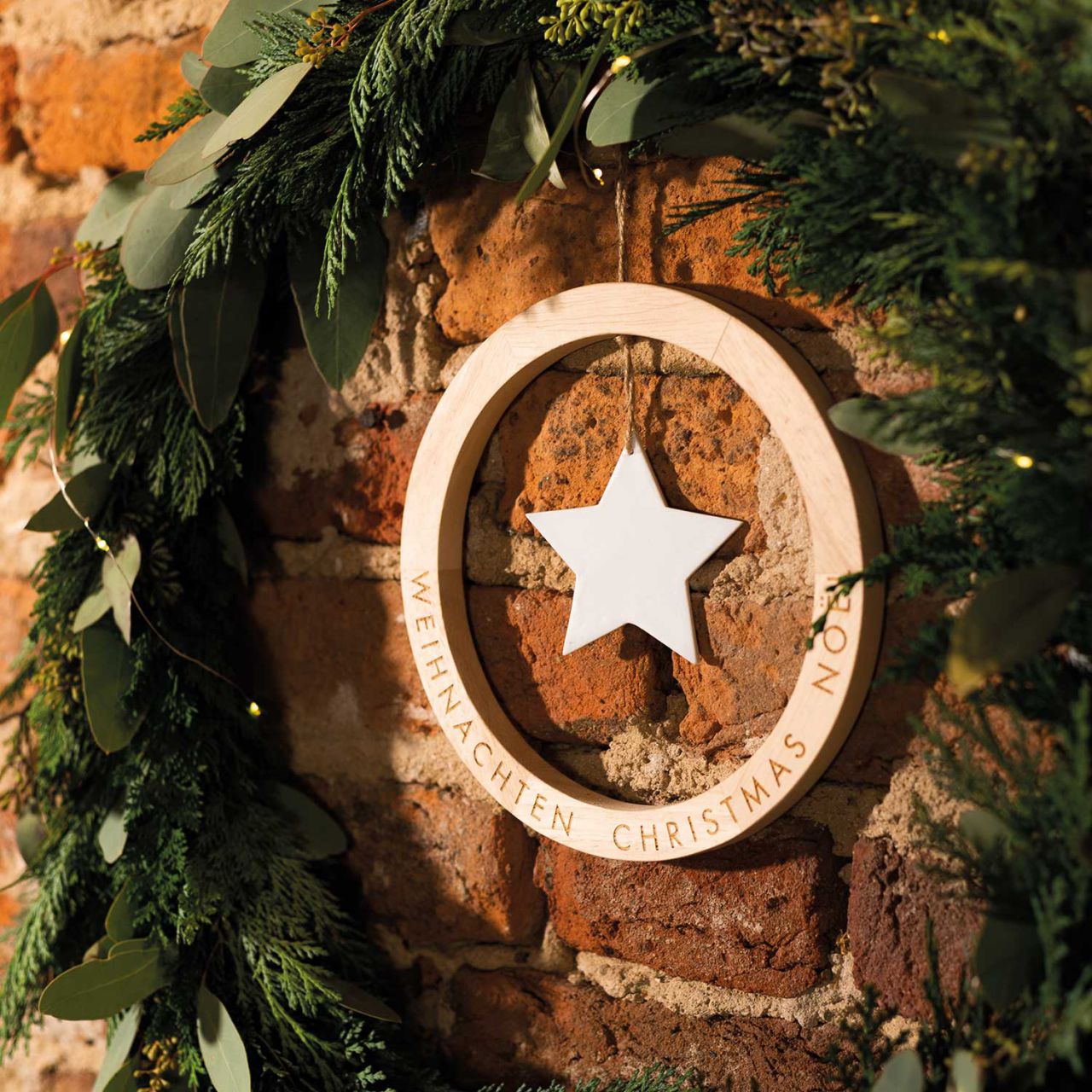 Material: Holzring aus Gummibaumholz, Porzellanelement, unglasiert. Aufhängung an Sisalband.