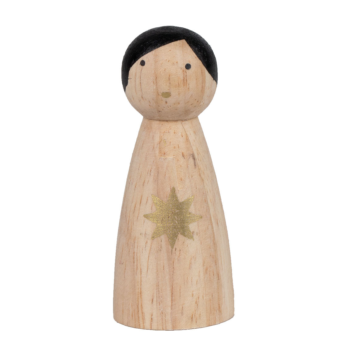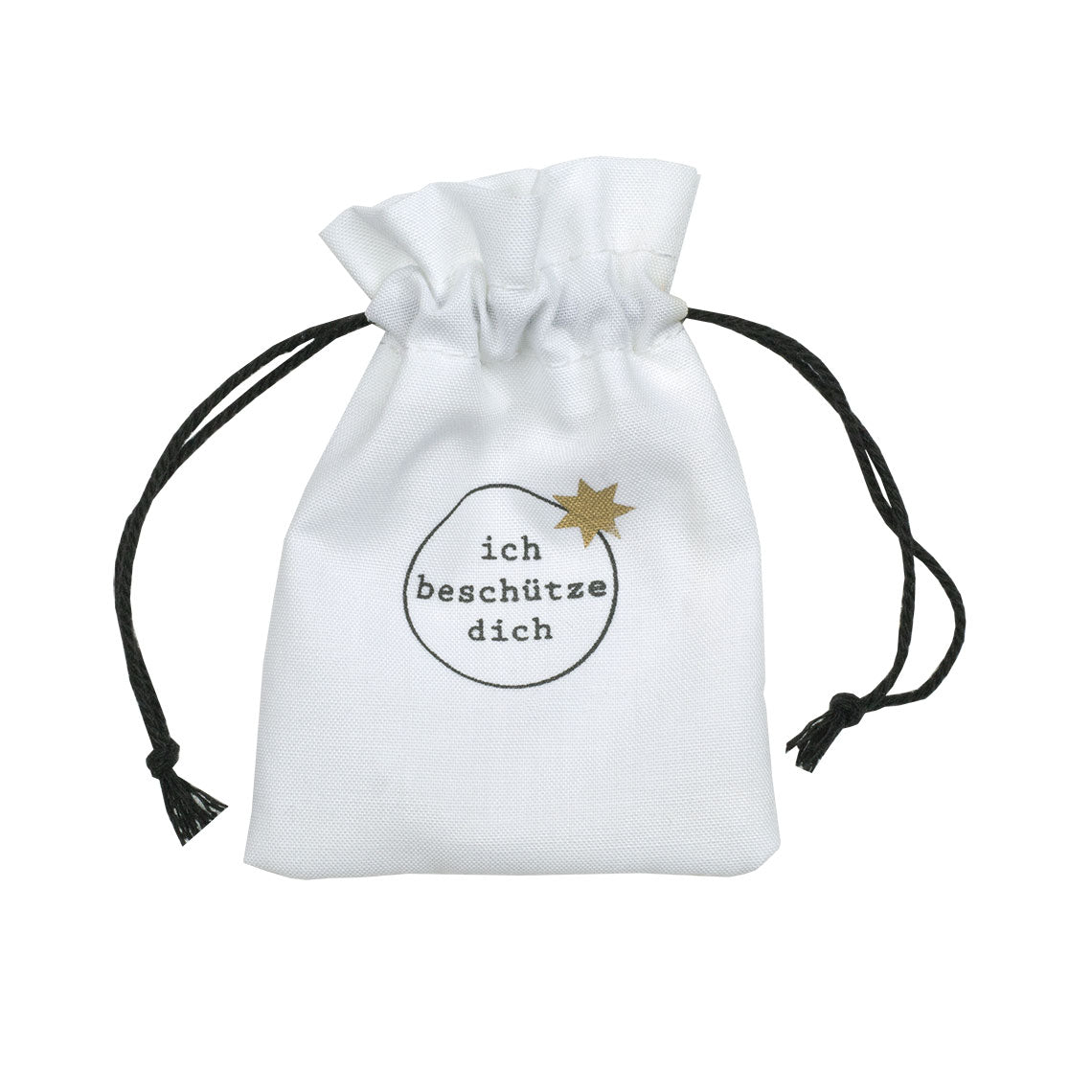 Bemalte Holzpüppchen, bedruckter Stoffbeutel.
